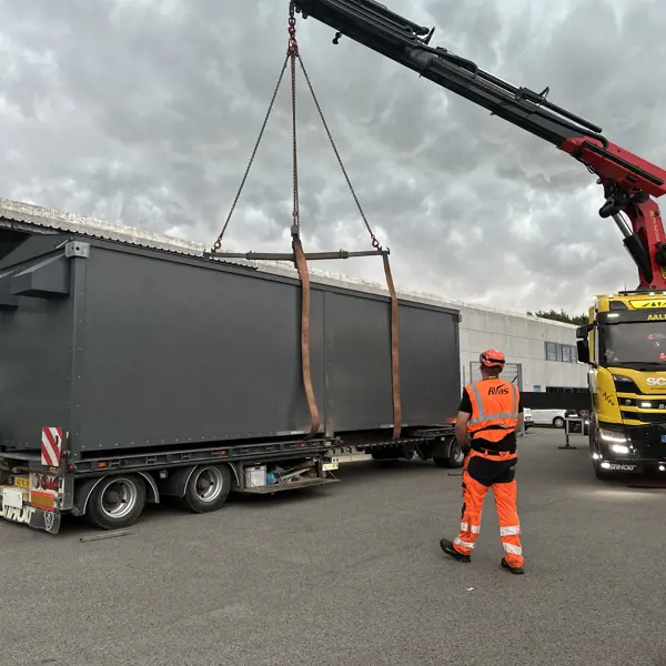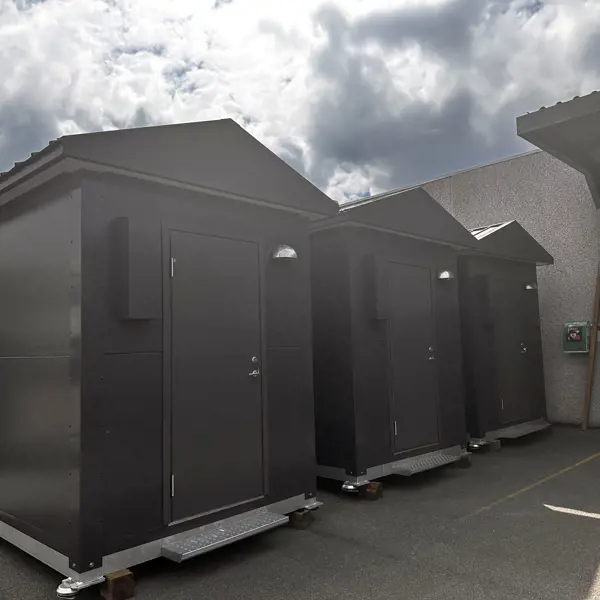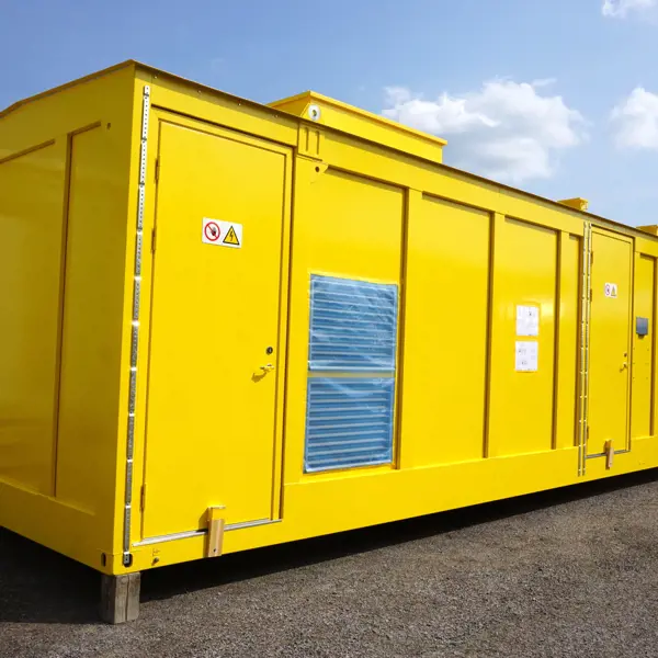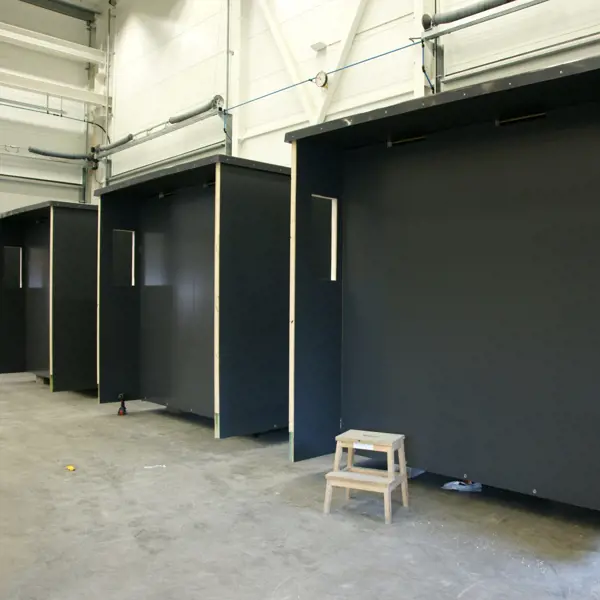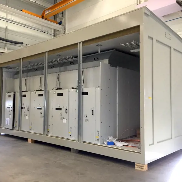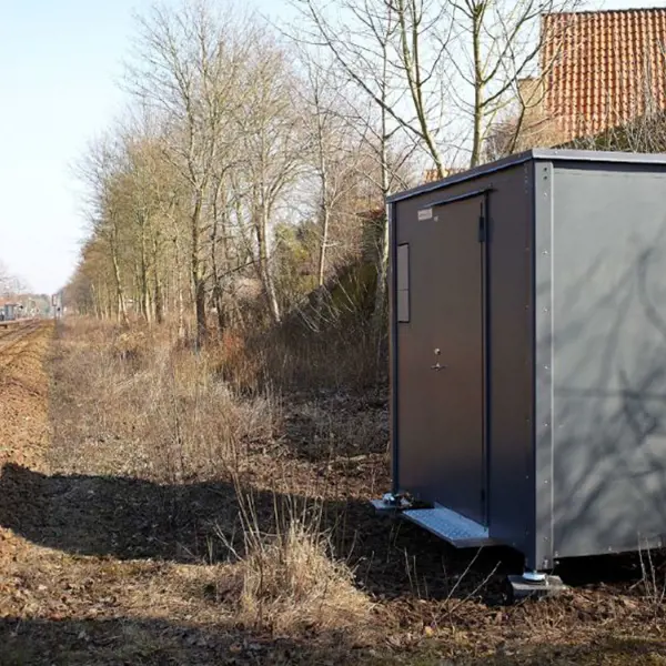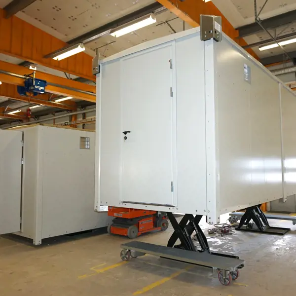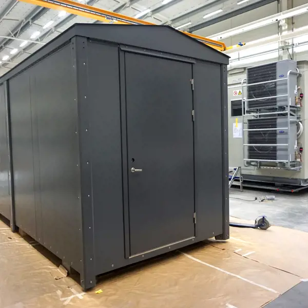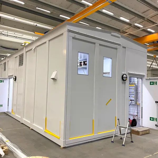 They can be delivered fully equipped with electrical installations, switchgear, panels and possibly a toilet, in one or two buildings that are assembled on-site.
