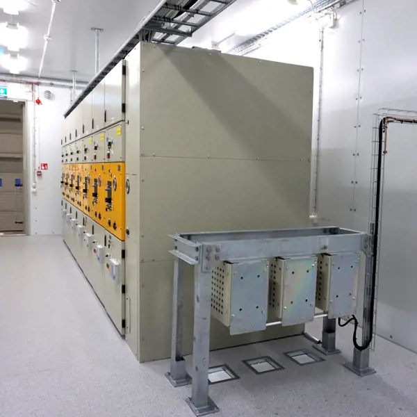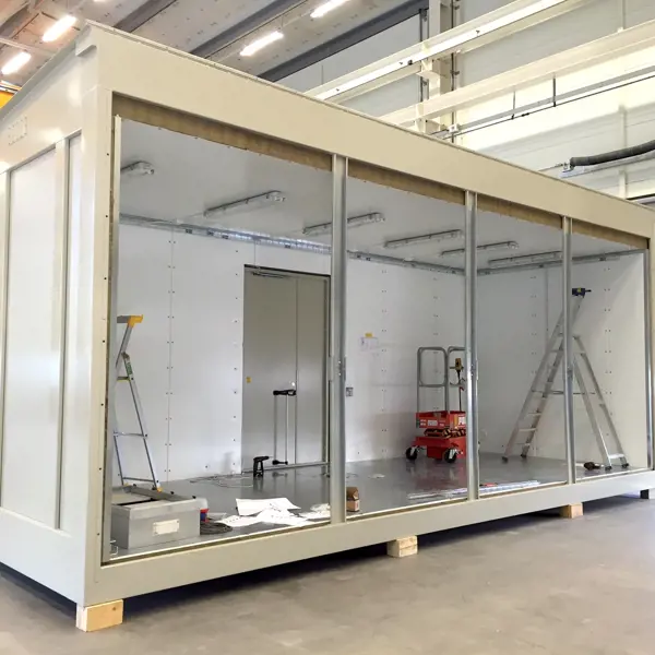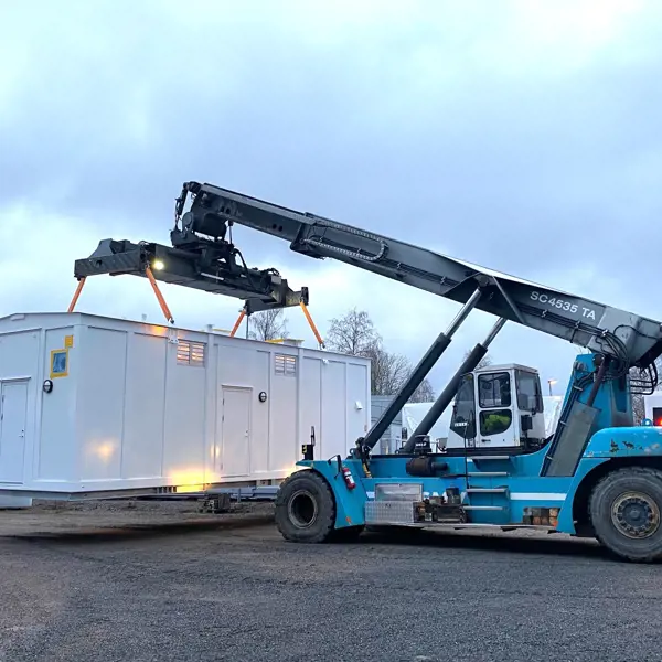 They can be delivered fully equipped with electrical installations, switchgear, panels and possibly a toilet, in one or two buildings that are assembled on-site.
