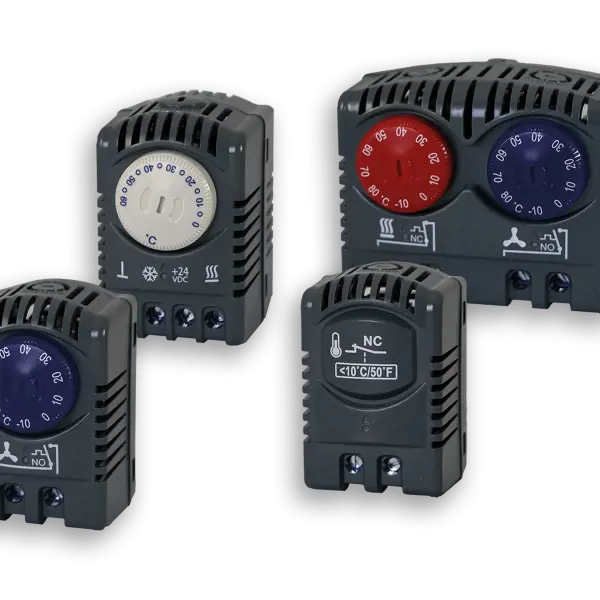 Soliflex thermostats and hygrostats ensure an optimal climate inside enclosures. They are available as normally closed/NC (red disk) or normally open/NO (blue disk) and come in mechanical or electronic versions.