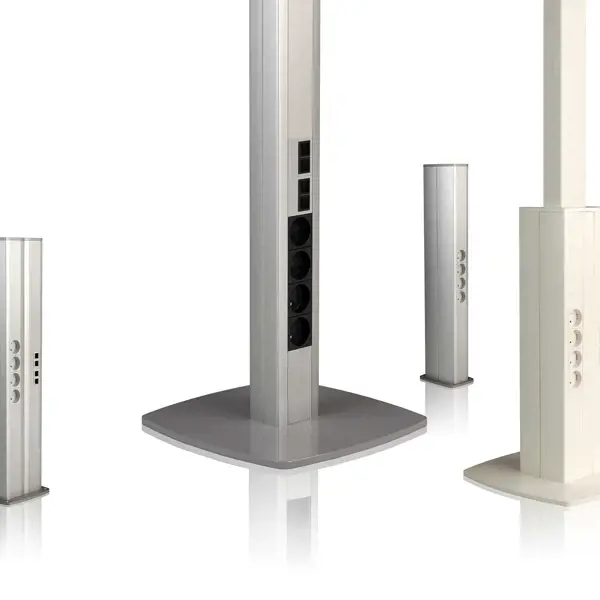 The floor stand is designed as a fixed installation on the floor and is typically powered from the bottom of the stand. This solution is available as a 1- and 2-track solution, as well as installation on both the front and back, making it possible to power multiple workplaces at the same time.